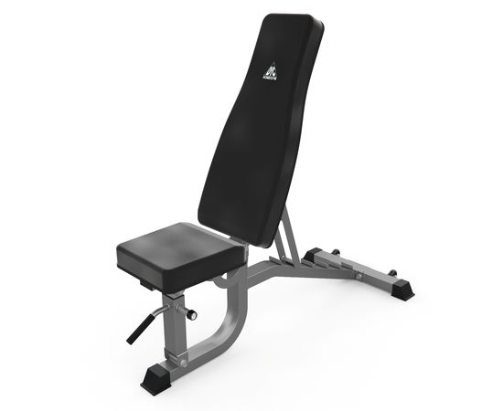 Универсальная силовая скамья DFC D100834 с прочной рамой и нетипичными сиденьем и спинкой. Толщина - целых 70 мм, что делает их долговечнее и комфортнее для тренировок.