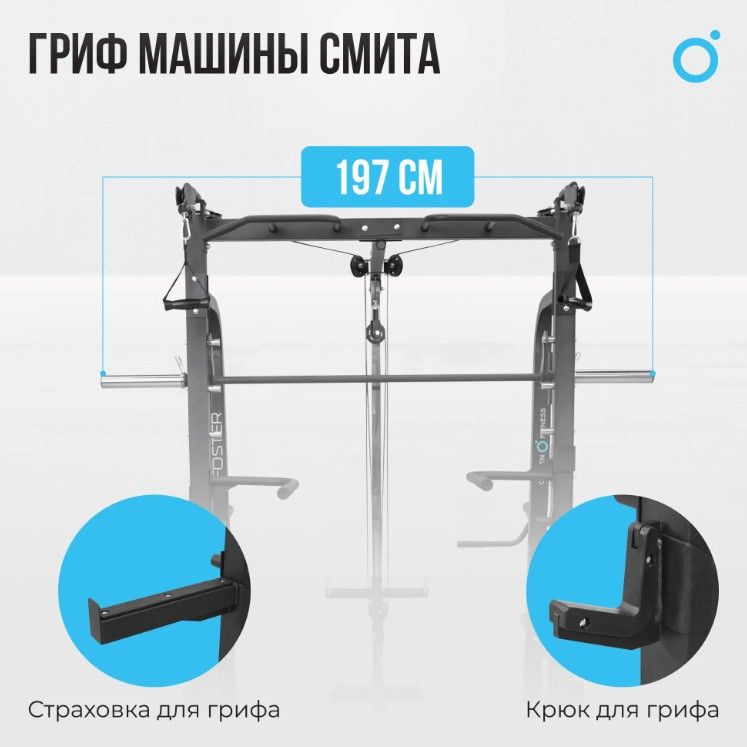 Дополнительно Гриф - 197 см, Ф50, 9 уровней регулировки, 2 стакана для грифа, 4 пружинных замка для грифа. Силовая рама. Машина Смита. Многопозиционный турник. Многопозиционные брусья. Двойная тяга. Гребная тяга. Шарнирный крепеж грифа.