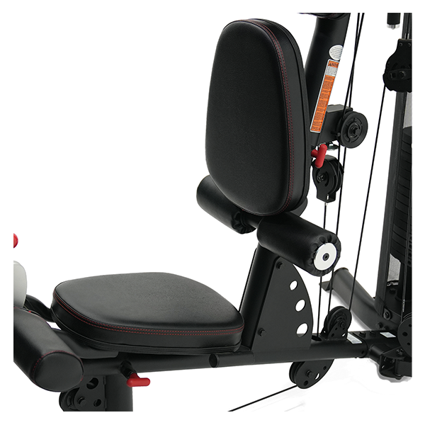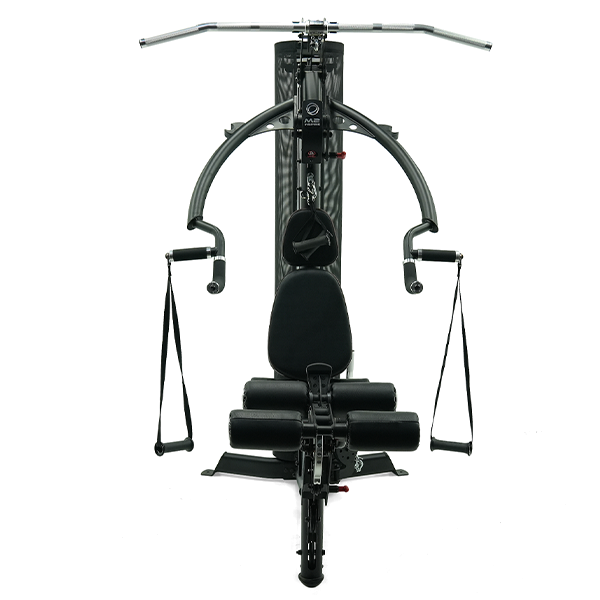 Весовой стек на 75 кг защищен кожухом, что обеспечивает безопасность во время тренировок. При необходимости нагрузку можно увеличить до 98 кг. В состав станции входят 6 тренировочных блоков: верхний тяговый блок, основную жимовую раму, срединный тяговый блок над спинкой, жимовые стрэп-рукояти, многоуровневый тренажер для разгибания ног и боковой тяговый блок.
