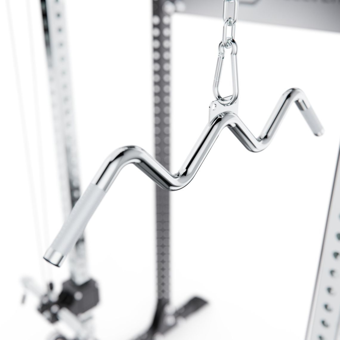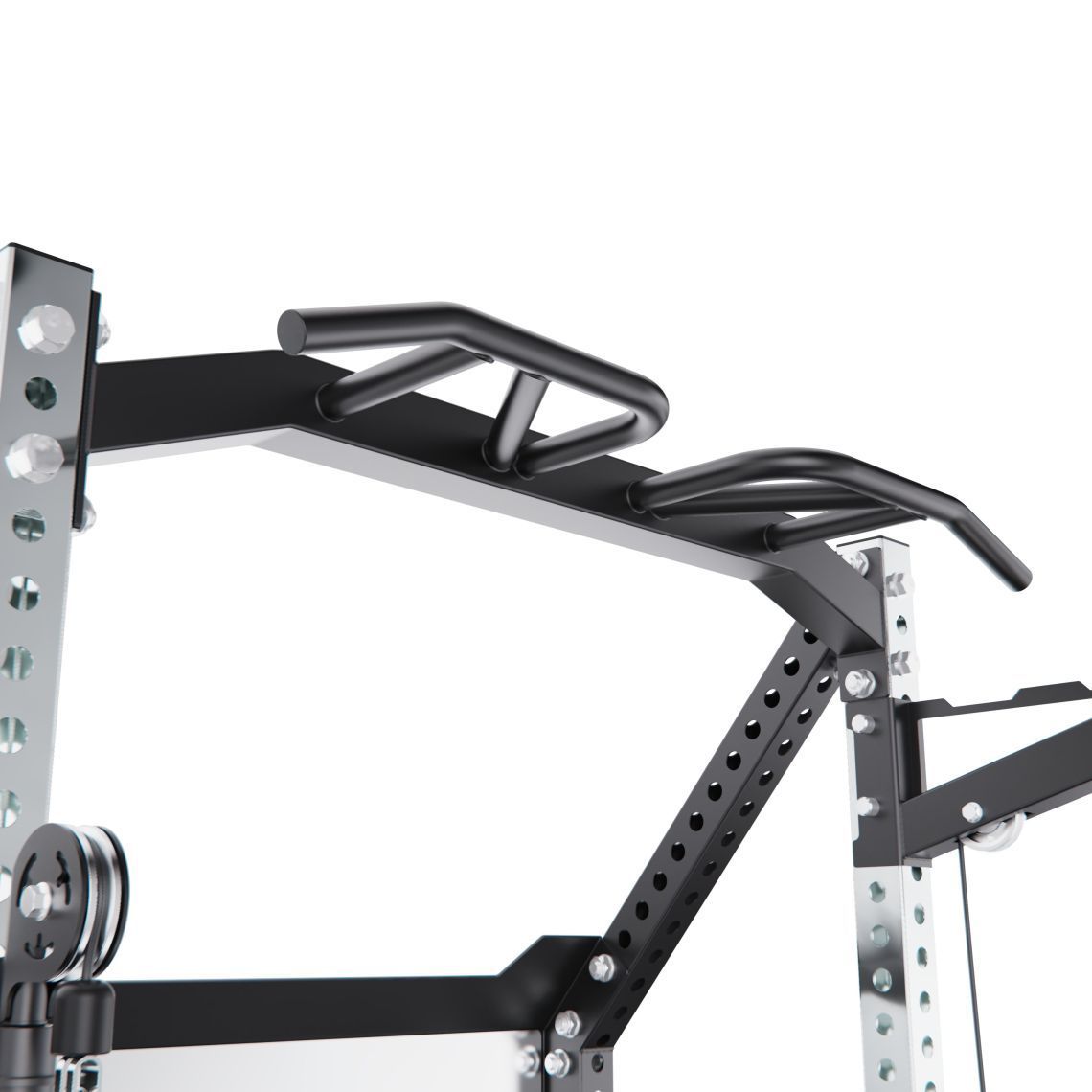 Верхняя тяга оснащена W-образной рукоятью, а многопозиционный турник позволяет выполнять различные варианты подтягиваний и упражнений на верх тела, делая тренировки более разнообразными.