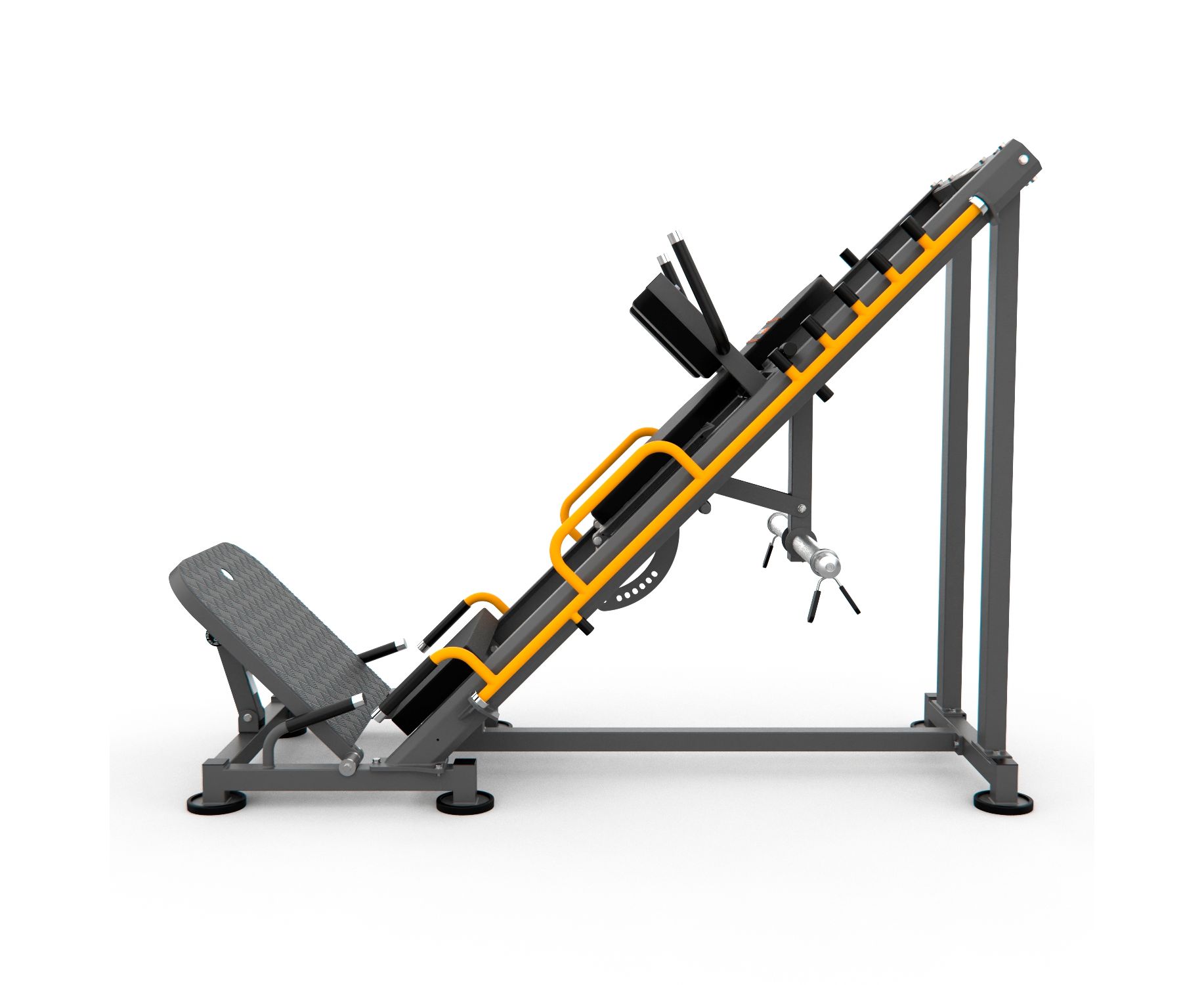 Профиль основной трубы 50х50 мм, а его толщина 2 мм.Максимально допустимая нагрузка до 400 кг, что в 2 раза больше, чем у прочих моделей STONRISE DLP. Благодаря этому свойству тренажёр отлично подходит для профессиональных тренировок. Угол наклона спинки для приседаний регулируется на 4 уровня, а спинки для жима ногами – на 6 уровней. Платформа для ног с рифлёным покрытием толщиной 5 мм регулируется по высоте. Стопорные болты диаметром 25 мм осуществляют регулировку высоты подушек на 5 уровней.