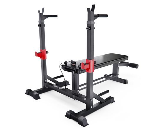 Прямая силовая скамья со стойками под штангу DFC D2031TJ07 — идеальный выбор для домашних тренировок! Скамья выдерживает активные нагрузки до 277 кг, что помогает использовать её как новичкам, так и профессиональным спортсменам. Тренажер позволяет легко выполнять различные упражнения, включая жим лежа, жим от плеч, приседания, подъемы над головой, упражнения со штангой, отжимания на брусьях, подтягивания, отжимания, что делает его универсальным.
