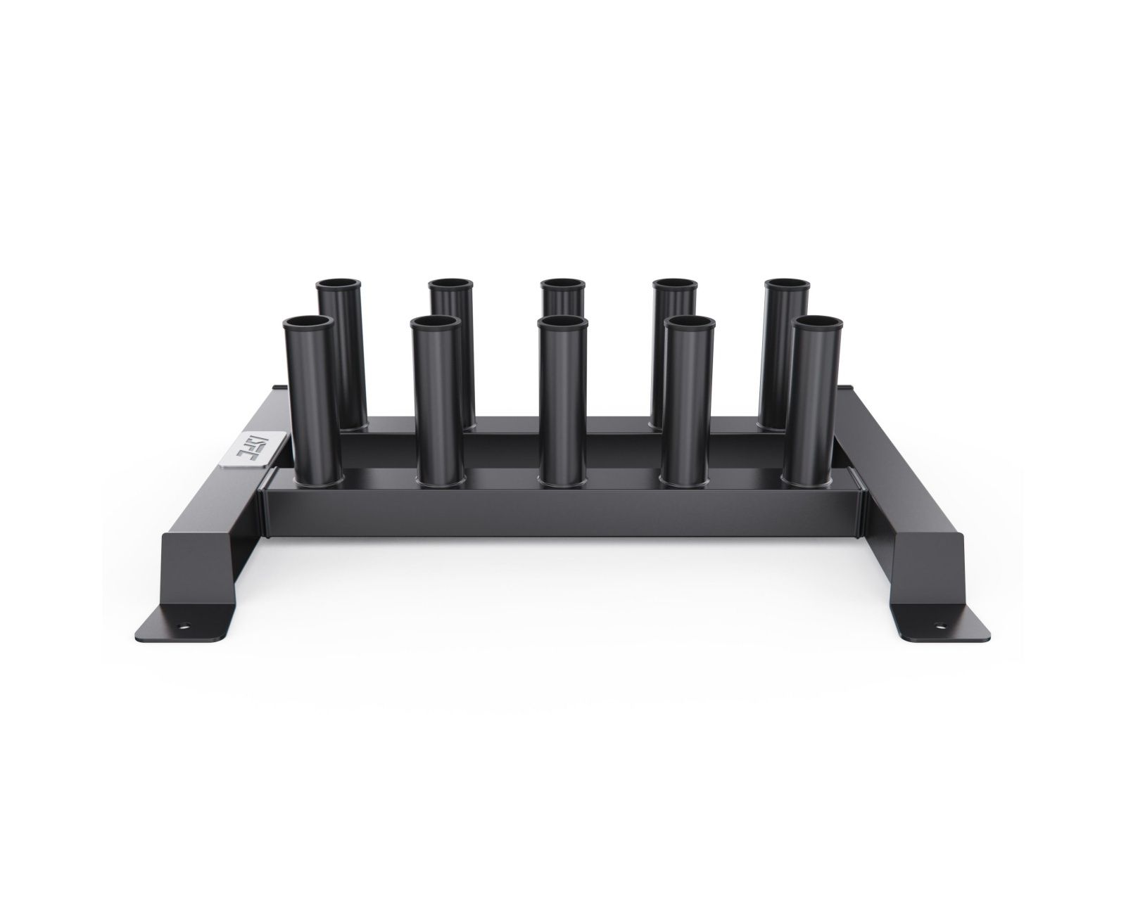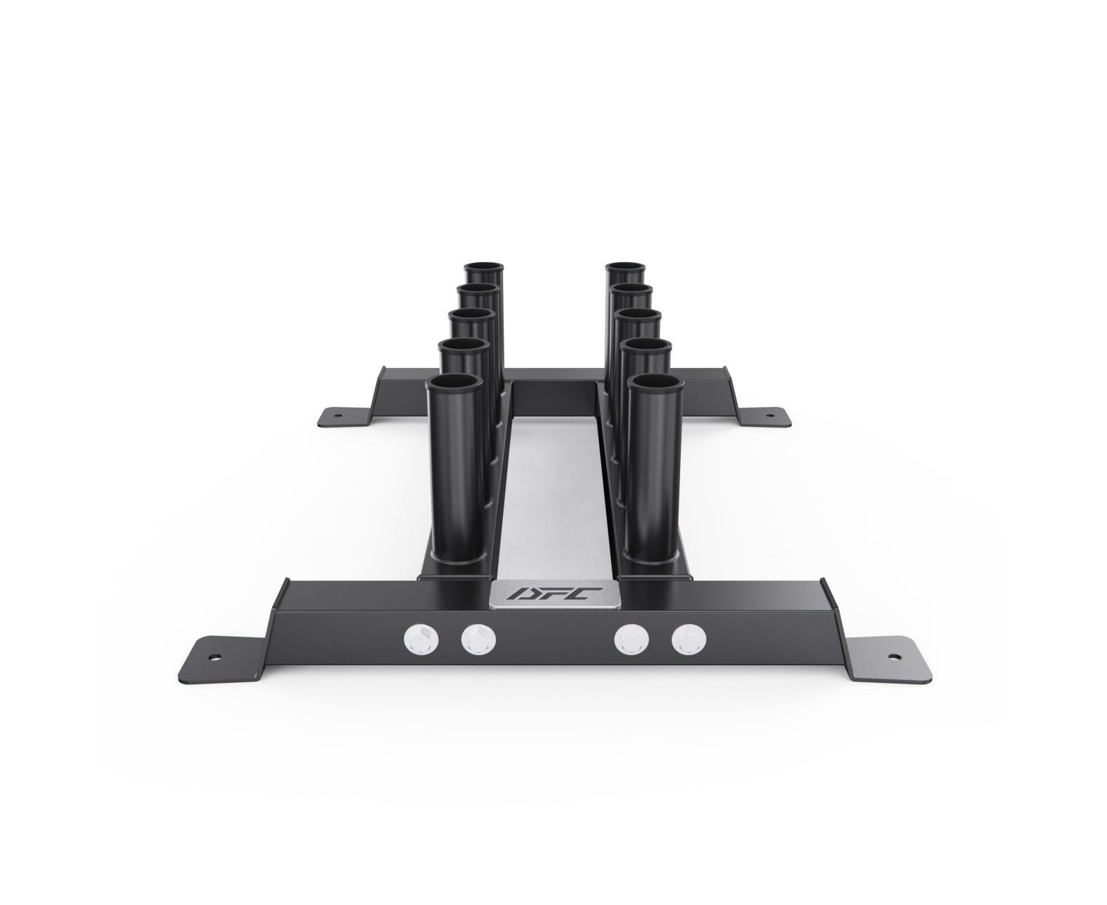 Диаметр посадочных труб составляет 50 мм, что соответствует стандарту олимпийских грифов. Стойка выдерживает максимальную нагрузку до 250 кг, обеспечивая безопасное хранение тяжелых спортивных снарядов.