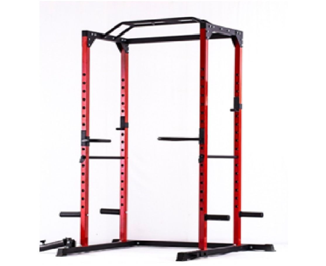 Рама выполнена из прочного стального профиля 50 х 50 х 1,5 мм, что обеспечивает надёжность и устойчивость конструкции. Посадочный диаметр — 50 мм, а количество посадочных мест — 4, что позволяет комфортно размещать и хранить диски + пружинные зажимы в комплекте. Максимальная нагрузка на держатель штанги и страховочную трубу составляет 100 кг, а на грузовую трубу — 50 кг, позволяя постепенно увеличивать рабочие веса.