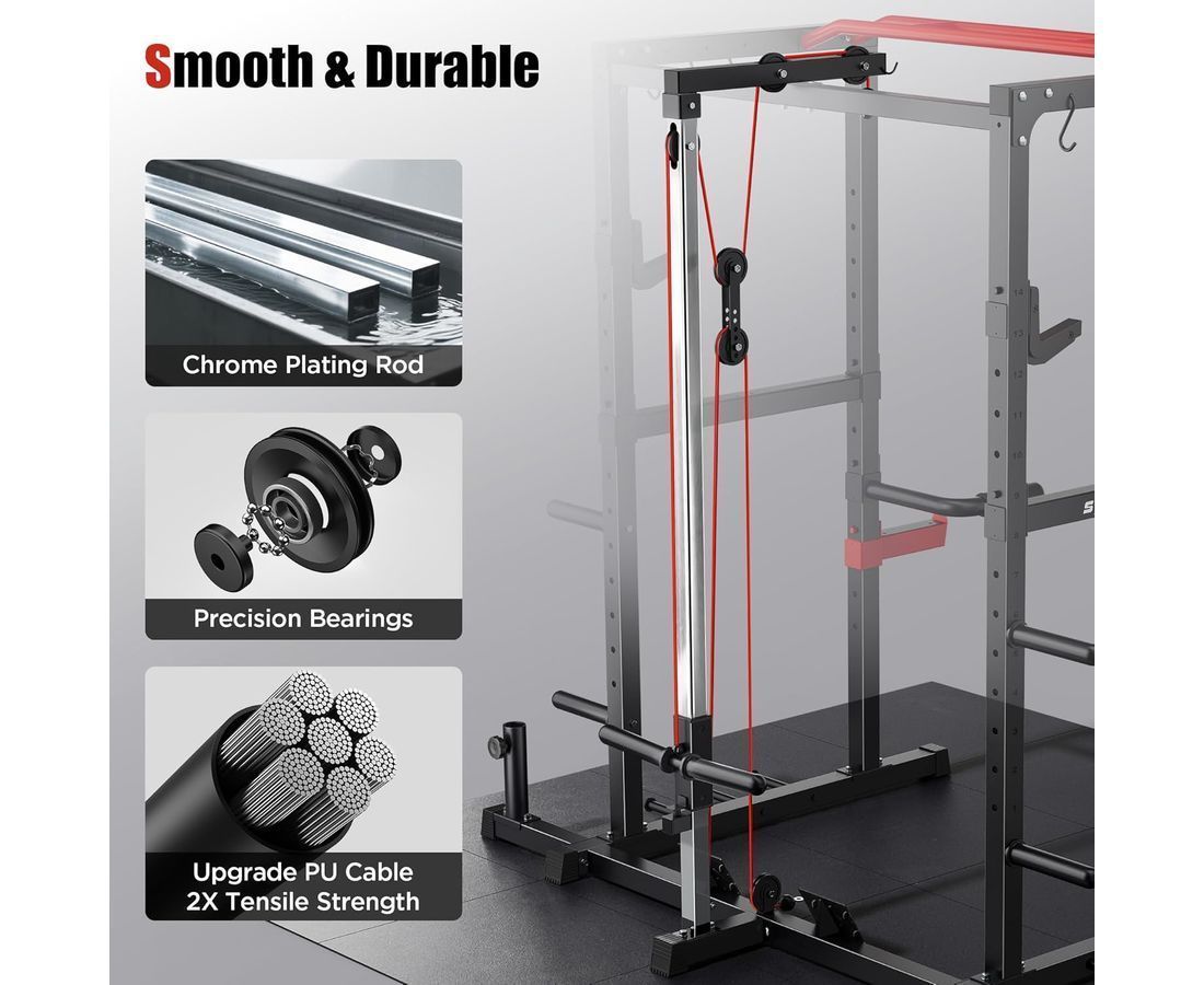 Модель оснащена системой верхних и нижних тяг, что позволяет выполнять вертикальную тягу широким и узким хватом, горизонтальную тягу сидя, тягу прямыми руками, поворот рукоятки на полный угол и разгибания на трицепс. Шкивы с прецизионными подшипниками обеспечивают плавность и мягкий ход. Телескопические стойки имеют защитное покрытие, устойчивое к коррозии, и рассчитаны на длительный срок эксплуатации. Конструкция включает четырнадцать уровней регулировки высоты, позволяя подстроить раму под задачи спортсмена.