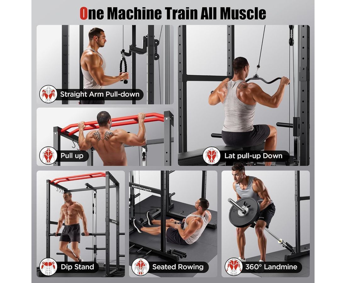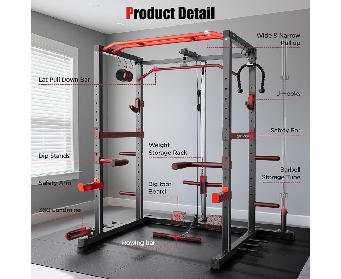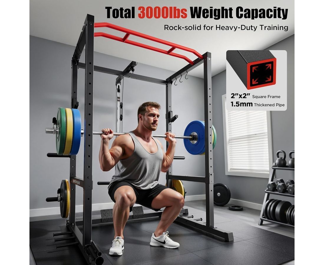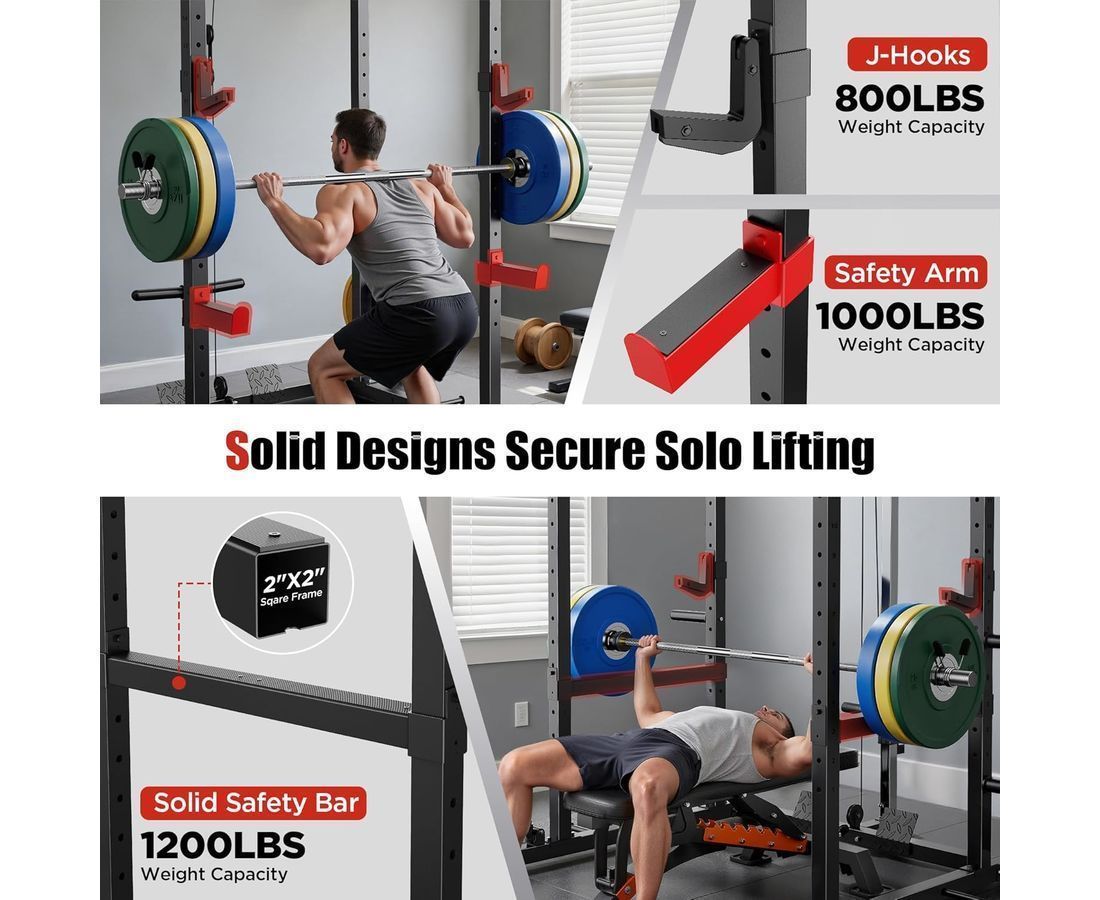Тренажёр подходит для приседаний, жима лёжа, становой тяги, упражнений со штангой, а также для развития спины, груди, рук и ног, заменяя полноценный спортзал дома. Защитные рамы выдерживают повышенные нагрузки, обеспечивая безопасность во время силовых тренировок. Телескопическая труба, стойка для хранения блинов и прочие элементы конструкции обладают высокой прочностью, что делает тренажёр идеальным для регулярных домашних занятий.