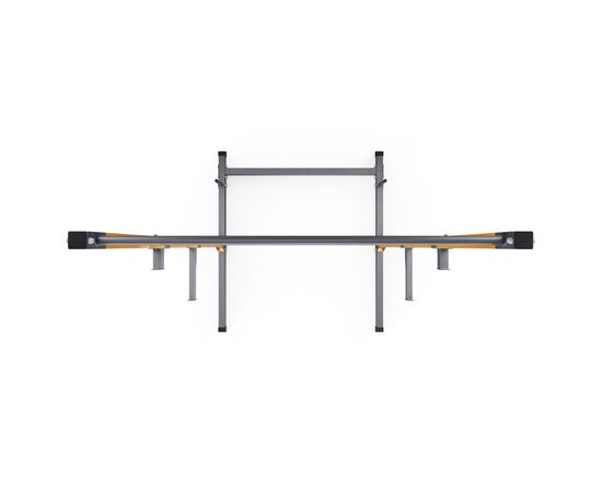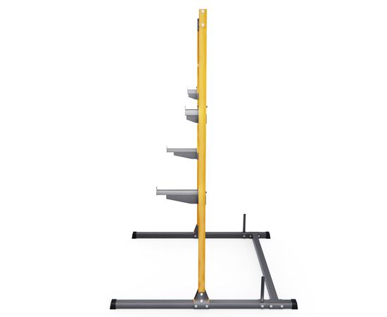 2 пары держателей для штанги регулируются на 21 уровень по высоте с шагом 8 см. Для хранения дисков предусмотрены 2 держателя по углам тренажера длиной 20 см (Ø25 мм). Нескользящие ножки надежно устанавливаются на полу и не царапают поверхность.