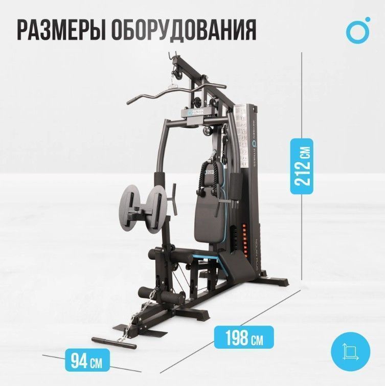 Дополнительно Комплектация: канат для трицепса, рукоятка для тяги сверху, манжета для ноги, прямая рукоятка, парта бицепса, неопреновые валики - 4 для ног (ф 8.5), 2 для рук (ф 9). Размеры подушек: парта бицепса – 30*40*5 (7) см, подголовник – 24*24*5 см, спинка – 30*50*5.5 см, сиденье – 39*35*5.5 см, 4 уровня регулировки по высоте. Жим ногами: регулировка - 5 ур.по высоте, 5 – по длине, место для ног – 35*45 см.