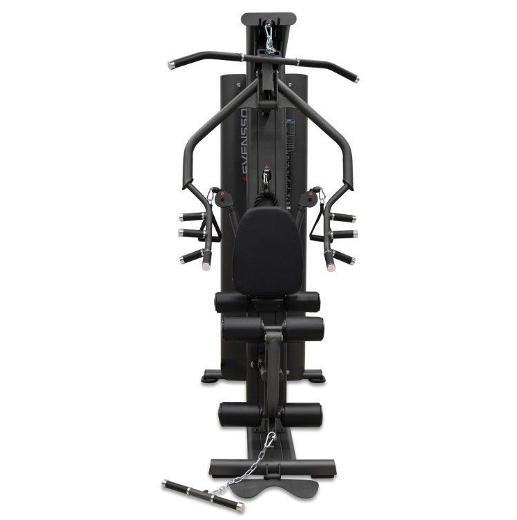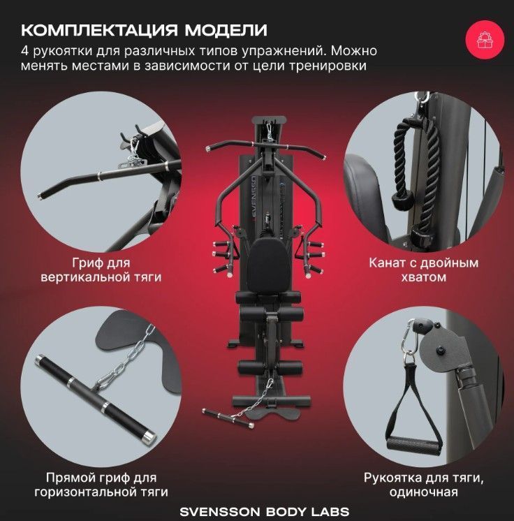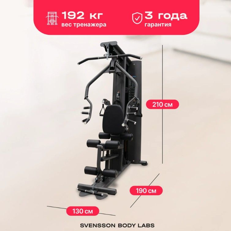 ОписаниеSVENSSON BODY LABS RIGEL PRO — это полукоммерческий силовой комплекс, предназначенный для эффективных тренировок всех групп мышц. Благодаря продуманной конструкции и широкому функционалу, он идеально подходит как для фитнес-центров, так и для тех, кто ценит качество и комфорт в домашних тренировках. Высокое качество материалов и продуманный дизайн обеспечивают долговечность и надежность оборудования. Комплекс оснащен грузоблочным стеком весом 60 кг, состоящим из 12 стальных плит по 5 кг каждая, что позволяет регулировать нагрузку до 90 кг. Регулировка положения сиденья, спинки и тяговых элементов осуществляется по нескольким уровням (до 7 для тяги, 5 для спинки, 4 для сиденья по высоте), обеспечивая комфорт и индивидуальную настройку под каждого пользователя. Эргономичное сиденье с наполнителем из PU-поролона и обивкой из искусственной кожи гарантирует комфорт во время тренировки. Общий размер комплекса в рабочем состоянии составляет 190 см в длину, 130 см в ширину и 210 см в высоту. Максимальная допустимая нагрузка для пользователя — 140 кг, что делает комплекс универсальным для большинства спортсменов. Подушки и валики выполнены из искусственной кожи и имеют размеры: спинка — 45.5х36х5.5 см, сиденье — 45.5х34х5.5 см, диаметр валика - 11 см, что обеспечивает комфорт и поддержку при выполнении различных упражнений. SVENSSON BODY LABS RIGEL PRO — идеальный выбор для эффективных и безопасных тренировок в условиях полукоммерческого использования. Ключевые преимущества SVENSSON BODY LABS RIGEL PRO: • многофункциональность: возможность выполнять упражнения на все группы мышц; • надежность и качество материалов: стальной трос и прочный грузоблочный стек; • регулируемость и комфорт: многоуровневая настройка сиденья, спинки и тяговых элементов;