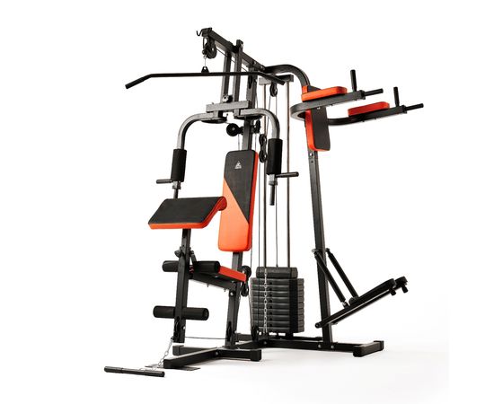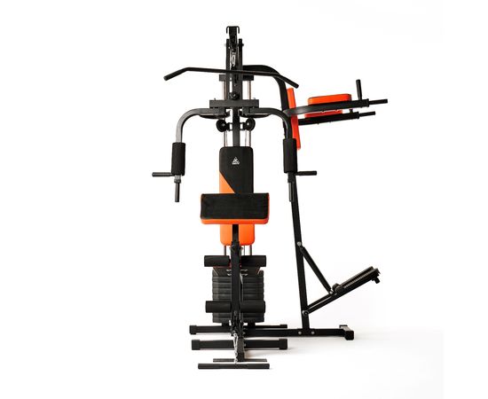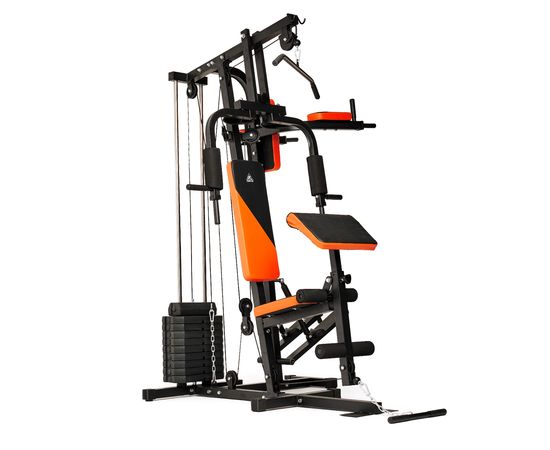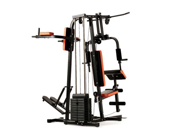 Силовой комплекс DFC из серии HomeGym D7002 предназначен для прокачки всех групп мышц: рук и верхнего плечевого пояса, спины, грудных мышц, пресса, ног. Позволяет выполнять силовые упражнения с разным функционалом для наилучшей эффективности тренировки. Сиденье и спинка с плотной обивкой чёрного цвета с оранжевыми вставками зафиксированны для комфортного выполнения упражнений. Парта для бицепса из той же ткани регулируется по высоте на 3 уровня. Степпер с гидроцилиндрами для дополнительной нагрузки. Максимальный вес пользователя — 120 килограмм.