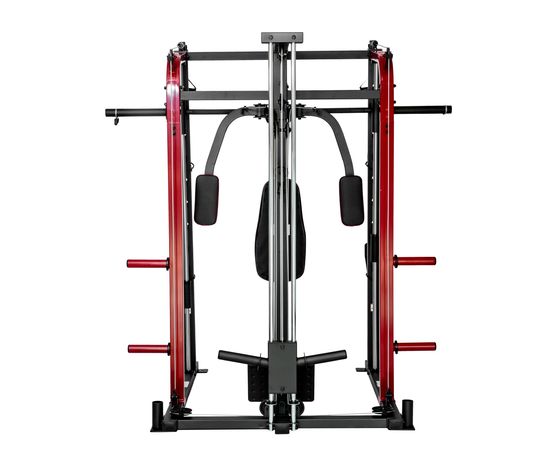 Тренажер предназначен для выполнения различных силовых упражнений: Машина Смита, тяга сверху / снизу, баттерфляй, парта для бицепса, сгибание / разгибание, жим лежа на скамье дополнительной штанги (штанга и диски опция).