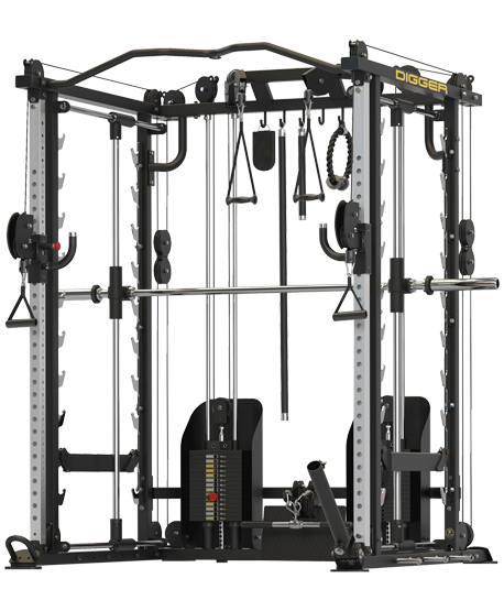Мультикомплекс Hasttings Digger HD009-7 — это многофункциональная станция для комплексных тренировок, которая сочетает в себе: 3D Машину Смита, двойную регулируемую тягу, силовую раму, нижнюю тягу, два независимых блока внутри рамы для верхней тяги, тренажер Landmine, крепление для каната, блочные ручки и манжеты для различных упражнений в комплекте.