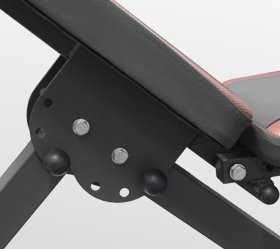 Жимовая скамья для средних нагрузок с профилем 50*50 мм. и максимальным совокупным весом нагрузки 150 кг. За счет широких возможностей по регулировке тренажер можно использовать как стандартную скамью для жима (угол наклона спинки 45 градусов), как горизонтальную скамью или скамью с отрицательным наклоном (угол наклона -25 градусов). Валик для ног обладает свободным ходом и зависит от положения скамьи. Подставка под гантели рассчитана на хранение двух пар гантелей (сами гантели в комплект не входят). Скамья складывается и удобна в хранении, ее можно положить под кровать, поставить за дверь иди в кладовку - в сложенном виде ее высота составляет всего 20 см.