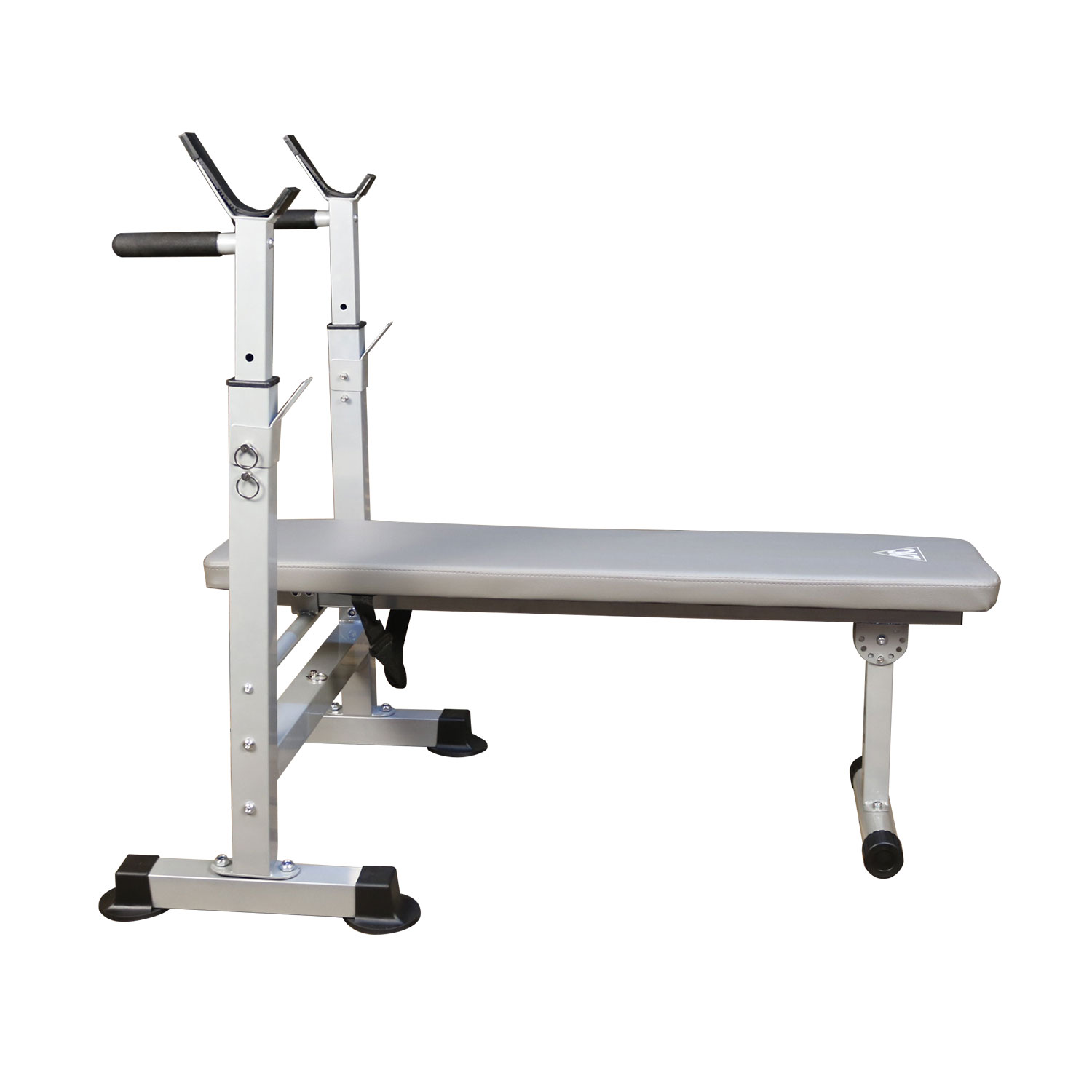 Скамья силовая со стойками под штангу. Предназначена для выполнения различных упражнений: жим штанги лежа, отжимания на брусьях и другие.