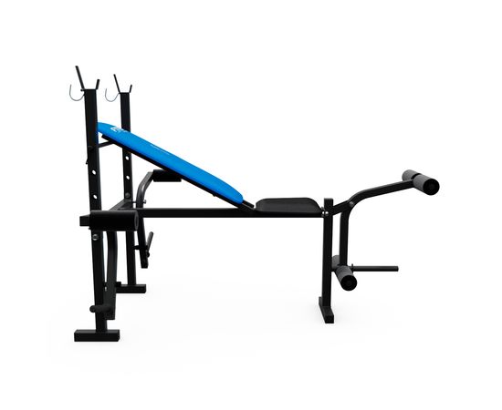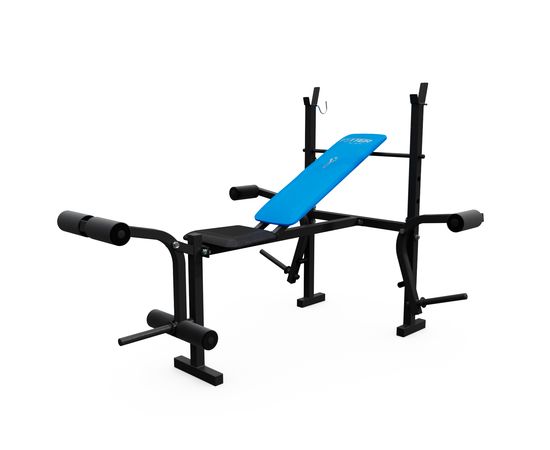 Расстояние между стойками в 55.5 см позволяет использовать самые разные виды штанг. В комплекте идут специальные валики, которые можно использовать как для жима руками, так и для жима ногами. Цвет спинки скамьи - ярко-голубой. Четырёхпозиционная спинка регулируется по углу наклона, что позволяет настроить тренажер под индивидуальные особенности пользователя и выполнять самые разные упражнения.