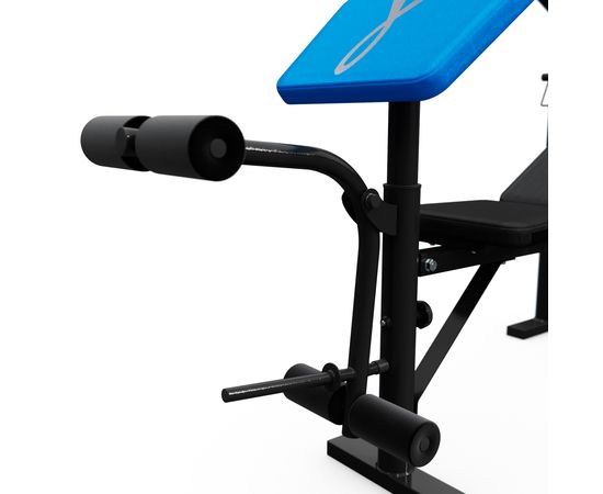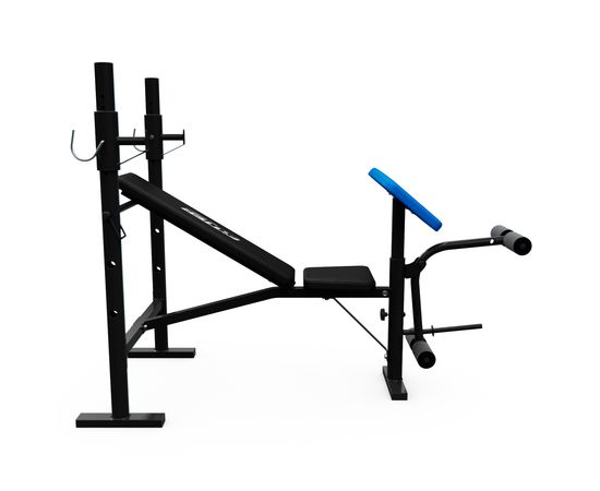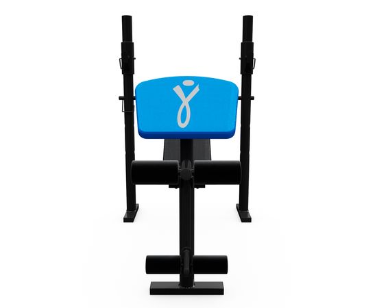 Расстояние между стойками скамьи составляет 63 сантиметра, что позволяет использовать большинство видов штанг. Угол наклона скамьи регулируется, что дает возможность выполнять различные виды жима лежа и другие упражнения.