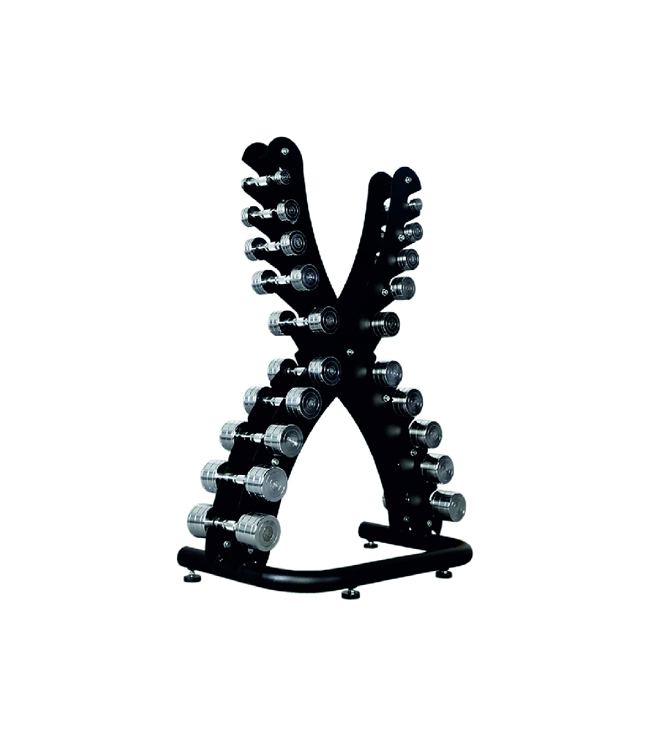 Гантели попарно располагаются с двух сторон стойки. Подходят для хромированных и гексагональных гантелей
