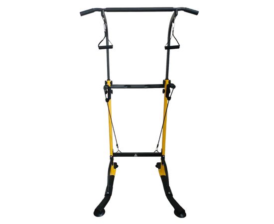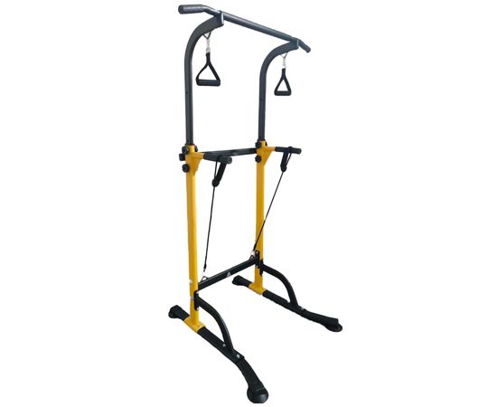 Турник-брусья DFC G007Y желтого цвета позволяет выполнять упражнения на разные группы мышц. Вес пользователя не должен превышать 110 килограмм.