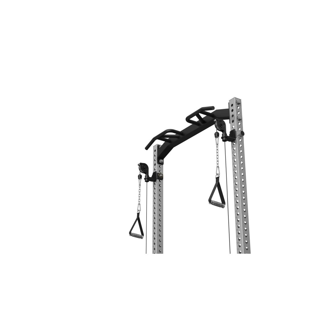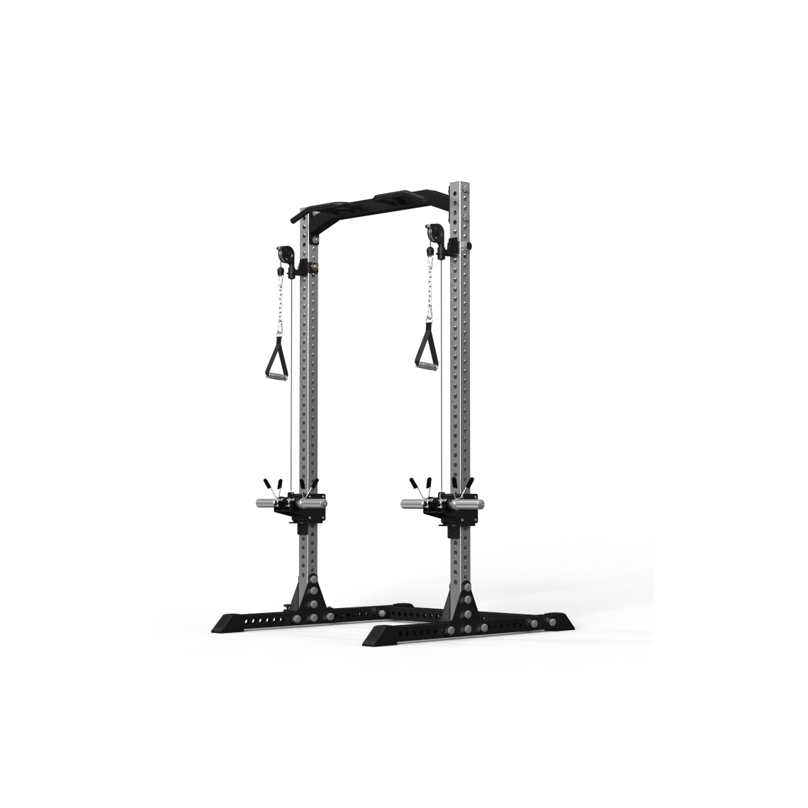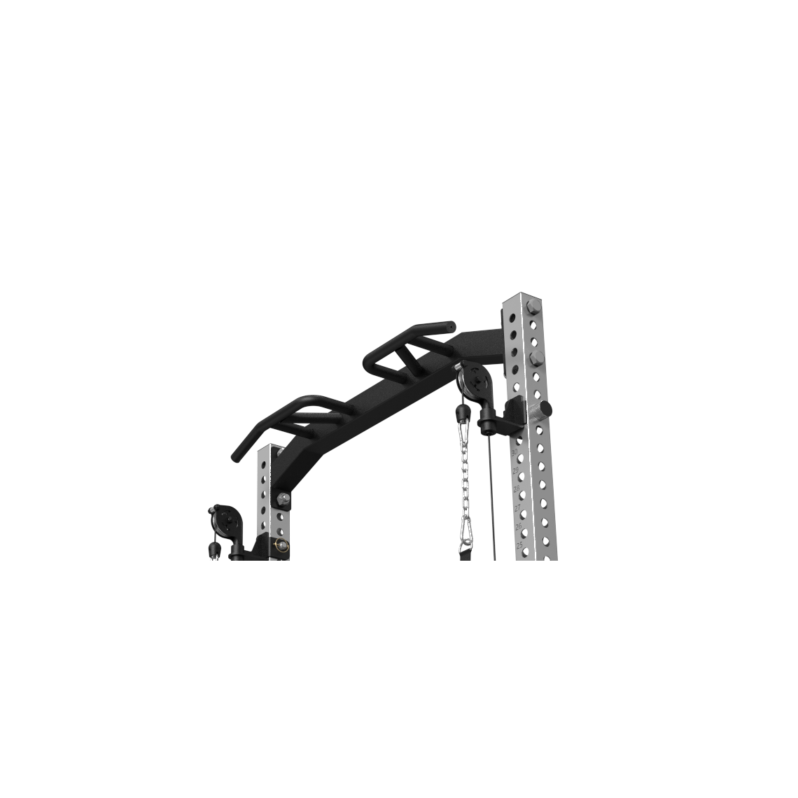 Встроенный кроссовер расширяет функциональность тренажера и позволяет прорабатывать все основные группы мышц. Кроме того, с одной стороны рамы предусмотрено специальное отверстие для установки грифа, которое позволяет использовать раму как Лэндмайн, выполняя жим и другие упражнения с естественной амплитудой движения.