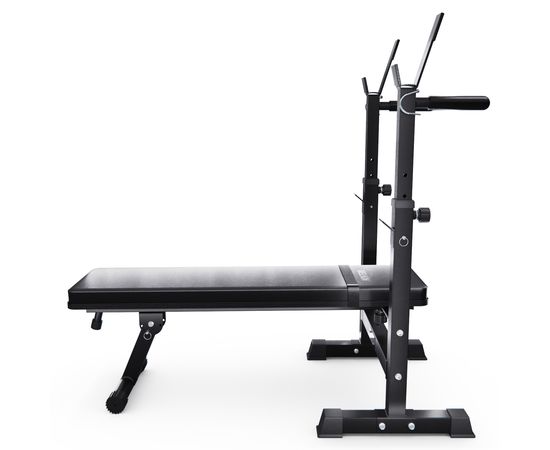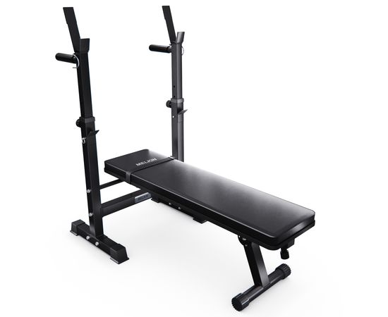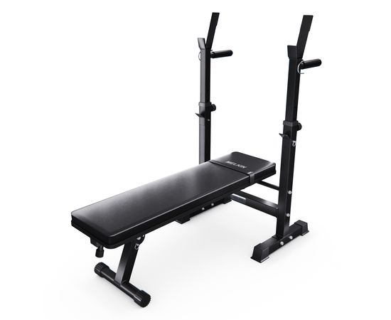 Скамья со стойками под штангу DFC MELKIN — идеальное решение для домашних тренировок! Благодаря складной конструкции и максимальной нагрузке до 200 кг, вы сможете выполнять разнообразные упражнения: на пресс, отжимания на брусьях и подъём штанги. Нагрузка на брусья — 100 кг, а на стойки — 150 кг. Профиль рамы выполнен из высококачественного металла размером 50 x 50 x 1,5 мм.