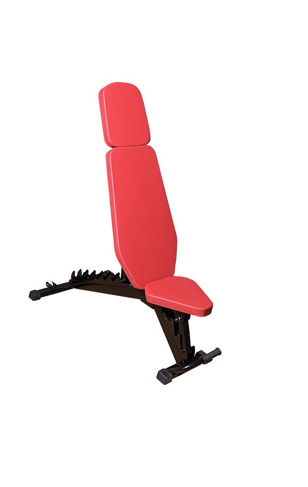 Универсальная скамья – используется для жима штанги, занятия с гантелями, а также для выполнения различных упражнений с тренажерами (силовая рама и машина Смитта). Скамья имеет: 7 положений спинки, что позволяет изменять угол наклона от горизонтального до 80 градусов и 3 положения сидения – от горизонтального до 45 градусов. Скамья имеет полимерные противоскользящие опоры, оснащена колесами из капролона и рукояткой, для удобства перемещения. Сидение и спинка выполнены из прочной фанеры толщиной 20 мм в основании, пенополиуретанового наполнителя толщиной 40 мм и винилискожи. Все используемые материалы устойчивы к износу и деформациям. Все элементы конструкции покрыты прочным порошковым покрытием.