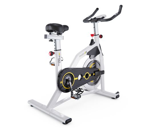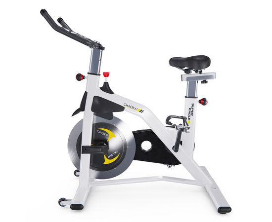 Спин-байк CHAOKE белого цвета удобнее и тише других. Прочная стальная рама и алюминиевый маховик весом 19 килограмм обеспечивают устойчивость во время езды на велосипеде. Он выдерживает нагрузку до 150 кг и подходит для пользователей ростом от 146 до 198 см.