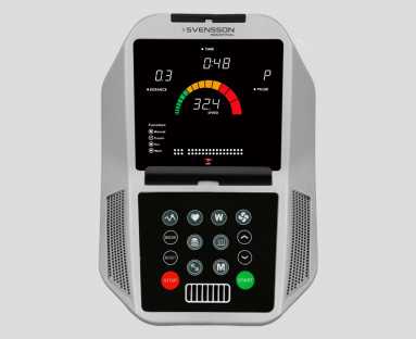 Тренировочный компьютер представлен дисплеем профессионального уровня. Основной экран использует светодиоды (LED), а 4 дополнительных буквенно-цифровых экрана работают на жидких кристаллах (LCD). На экран компьютера выводятся все основные данные - профиль тренировки, скорость, дистанция, количество оборотов в минуту, калории, ватты и пульс. При желании можно воспользоваться одной из 12 предустановленных программ, рассчитанных на снижение веса, тренировку выносливости, скоростных качеств, реабилитацию и т.д. На отдельную клавишу консоли выведены 3 режима высокоинтервальных тренировок. Ватт-программы также разделены и активируются разными клавишами. В первом случае нагрузка в ваттах (в диапазоне от 10 до 500 ватт) выставляется перед тренировкой и сохраняется неизменной до ее окончания. Во-втором - это 6 программных профилей с изменяемой нагрузкой на каждом тренировочном отрезке. Есть здесь и 4 классические пульсозависимые программы, они отвечают за тренировку тех пользователей, которым важно контролировать верхние пределы частоты сердечного ритма. Для точного определения пульса и просто комфортной тренировки в компьютер встроен высокоточный беспроводной телеметрический приемник (для считывания частоты сердечного ритма рекомендован нагрудный ремень-передатчик Polar T34).