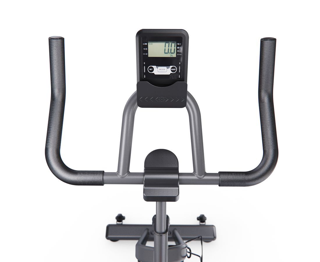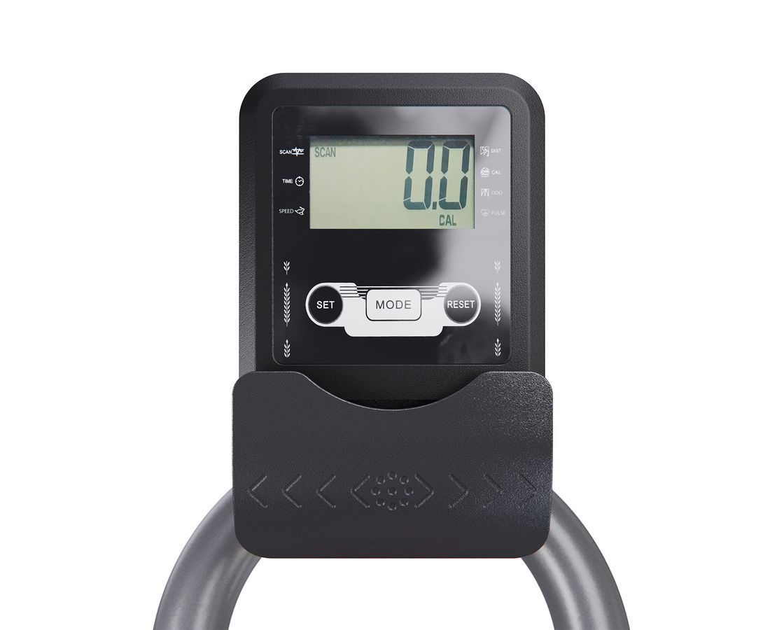 Велотренажёр выдерживает вес пользователя до 110 кг. Монохромный дисплей отображает такие параметры как время, скорость, дистанция, калории, количество оборотов в минуту и режим сканирования. Консоль работает при помощи двух батареек ААА (есть в комплекте).