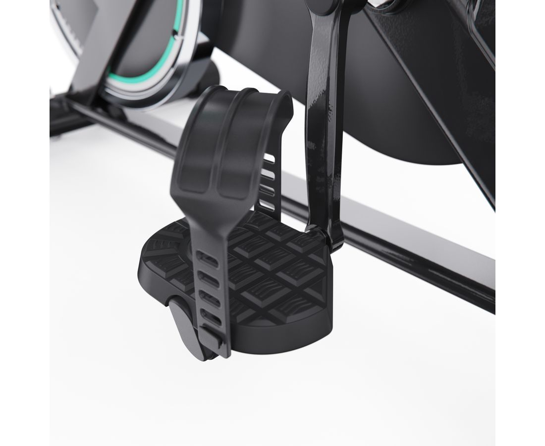Механическая колодочная система нагрузки с бесступенчатой регулировкой обеспечивает плавный и стабильный ход. Маховик с инерционным весом 12 кг даёт ощущение натуральной езды, что делает этот велотренажёр для ног особенно эффективным в проработке нижней части тела.