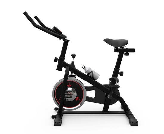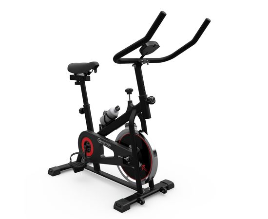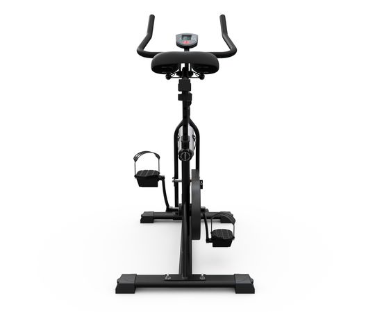 В комплекте со спин-байком идет бутылка для воды, держатель для нее, компенсаторы неровностей пола и транспортировочные ролики для удобства перемещения. Дисплей отображает время, скорость, расстояние и количество калорий, что помогает следить за прогрессом и эффективностью тренировок. Для работы дисплея требуется одна батарейка типа ААА, которая не входит в комплект.