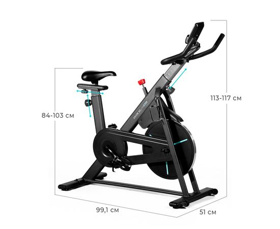 Спортивное сиденье регулируется не только по высоте и горизонтали, но и углу наклона, таким образом меняя интенсивность тренировки и положение пользователя в седле. Руль регулируется по высоте, делая тренировки комфортнее и продуктивнее. Спин-байк рассчитан на пользователя весом до 110 кг.