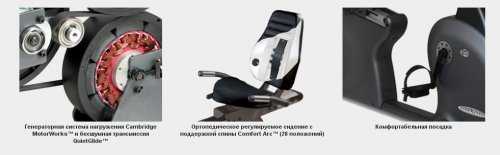 Генераторный велоэргометр горизонтального типа для залов со средней и высокой проходимостью. Биомеханическая часть построена на основе бесконтактной энергонезависимой технологии нагружения Cambridge MotorWorks™, бесшумной трансмиссии QuietGlide™, многожильного поликлинового ремня и самых высококачественных подшипников - все это создает неповторимую плавность хода, в то же время обеспечивая самую высокую надежность. Специальное 28-ми позиционное вспененное эргономичное сидение. Многофункциональный тренировочный компьютер, состоящий из одного большого дисплея для вывода профиля тренировки и шести второстепенных дисплеев с остальными параметрами, максимально информативен и имеет простую понятную навигацию. 12 тренировочных режимов - помимо классических и целевых, здесь есть программа снижения веса, 2 пульсозависимые программы и 3 Ватт-фиксированных режима. Профессиональный велоэргометр подойдет абсолютно всем, начиная от неопытного неофита и заканчивая матерым профессионалом. Достаточно габаритный, он позволяет заниматься на нем даже самым крупным «тяжеловесам».