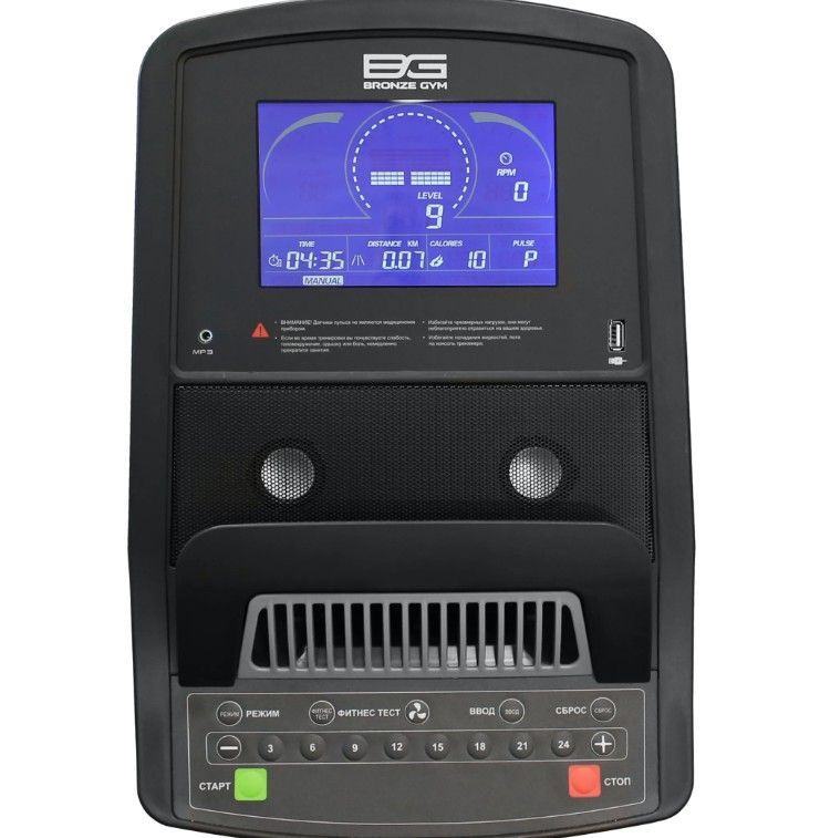 ОписаниеТренажеры бренда BRONZE GYM – это, прежде всего, надежность, безопасность, и эффективность тренировок. Они подходят для выполнения упражнений, как опытными спортсменами, так и начинающими пользователями. Результатом многолетней работы инженеров-конструкторов и дизайнеров бренда стала выпускаемая продукция, отличающаяся строгим дизайном, прекрасной биомеханикой и предотвращением нежелательных нагрузок на суставы. BRONZE GYM U800M_NEW – это профессиональный вертикальный велоэргометр, способный выдерживать максимальные нагрузки пользователей в режиме нон-стоп. В основе надежной конструкции - высокопрочная рама с двухслойной покраской и антикоррозийной обработкой. Все изделия массивные и тяжелые, что говорит о фундаментальности бренда. Основные преимущества U800M_NEW — это бесконтактная электромагнитная приводная система высшего класса (EMS) и сбалансированный маховик с инерционным весом 15 кг, которые обеспечивают эффективную биомеханику. Мягкое педалирование и равномерное распределение нагрузки на всем цикле движения осуществляется за счет супернадежного литого шатуна в педальном узле с использованием качественных подшипников. Тренажер имеет 24 уровня нагрузки, что позволит комфортно заниматься любому пользователю, есть быстрые клавиши регулировки нагрузки на поручнях. Модель U800M_NEW оборудована удобным сиденьем анатомической формы. К числу существенных биомеханических преимуществ относится возможность регулировки не только в вертикальном, но и горизонтальном положениях. Рифленые самобалансирующиеся педали с прорезиненными многопозиционными ремешками обеспечивают надежное сцепление на любых скоростях. Велоэргометр удобно перемещать благодаря двум транспортировочным роликам, а точное горизонтальное положение обеспечивают компенсаторы неровностей пола. Максимальный вес пользователя - 160 кг. Тренировочный компьютер представлен дисплеем профессионального уровня. Многофункциональный LCD-дисплей с графической матрицей и голубой подсветкой. На экран компьютера выводятся все основные данные – время, скорость, дистанция, уровень нагрузки, калории, ватты, темп, фитнес тест, пульс и температура в помещении. В программный пакет входят 12 предустановленных программ, в которых используются различные виды тренировок. Помимо предустановленных программ, можно воспользоваться самостоятельно регулируемым ручным режимом, а также создать собственную программу в одном из 4-х пользовательских режимов. 4 пульсозависимые программы отвечают за тренировку тех пользователей, которым важно контролировать верхние пределы частоты сердечного ритма. Плюс ко всему есть Ватт-программа. К числу дополнительных преимуществ модели относится возможность воспроизведения и вывода на динамики аудио файлов (через MP3-плеер, смартфон или планшет). Мобильное устройство можно расположить на подставке консоли и при необходимости зарядить (через USB-порт). Также приятной опцией является держатель для бутылочки с водой.