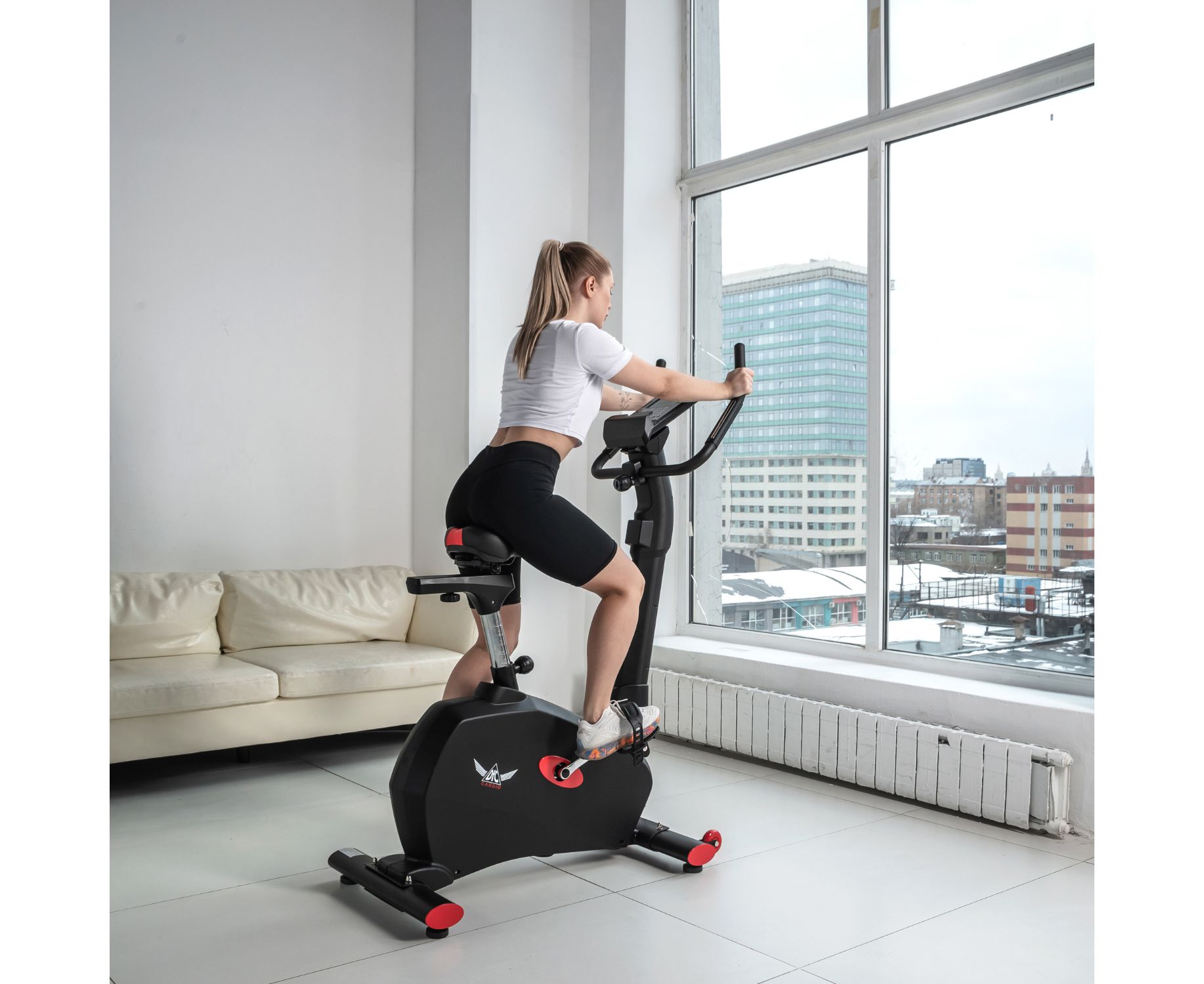 Тренажёр выполнен в стильном дизайне: бархатный чёрный цвет «разбавляют» ярко-красные вставки. Эта модель отмечена и логотипом производителя: крылатым значком DFC Cardio на боковой панели велотренажёра.