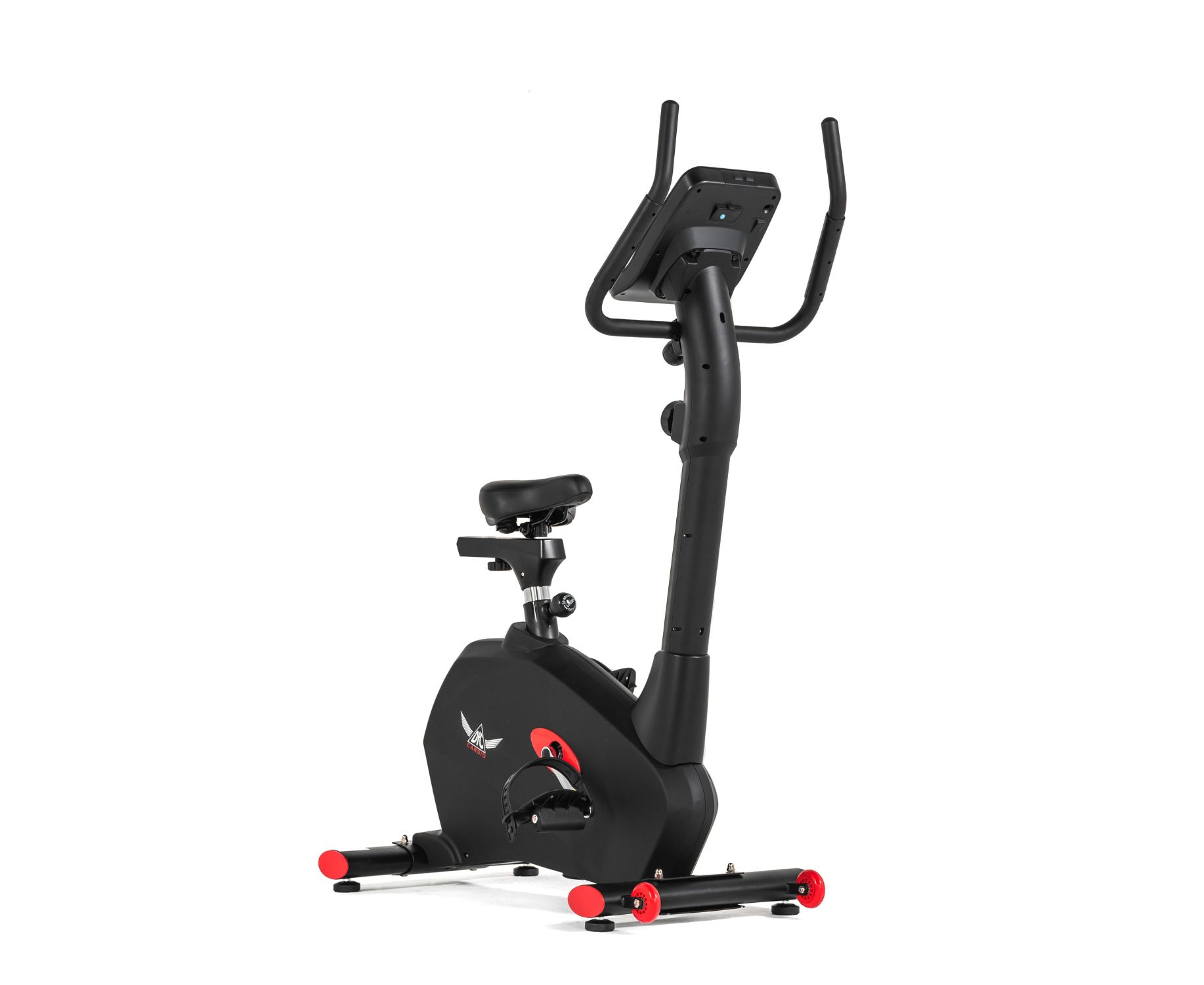 Тренажёр выполнен в стильном дизайне: бархатный чёрный цвет «разбавляют» ярко-красные вставки. Эта модель отмечена и логотипом производителя: крылатый значок DFC Cardio на боковой панели.
