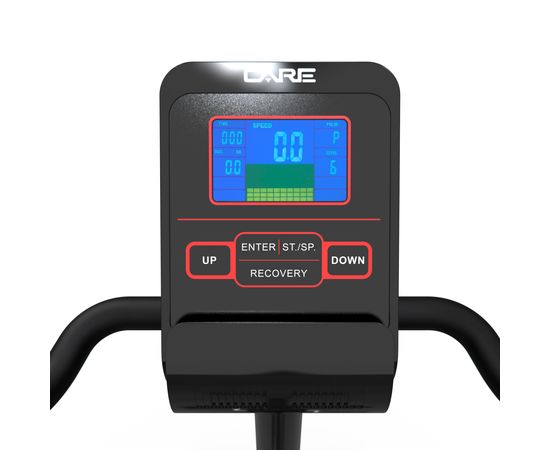 Дисплей велотренажера с синей подсветкой отображает множество параметров, включая профили пользовательских настроек, предустановленные программы тренировок, контроль мощности, контроль пульса, восстановление пульса, обороты в минуту, время, скорость, расстояние, количество сожженных калорий и ватты. На выбор пользователя представлена 21 программа тренировки, а также функция Bluetooth.