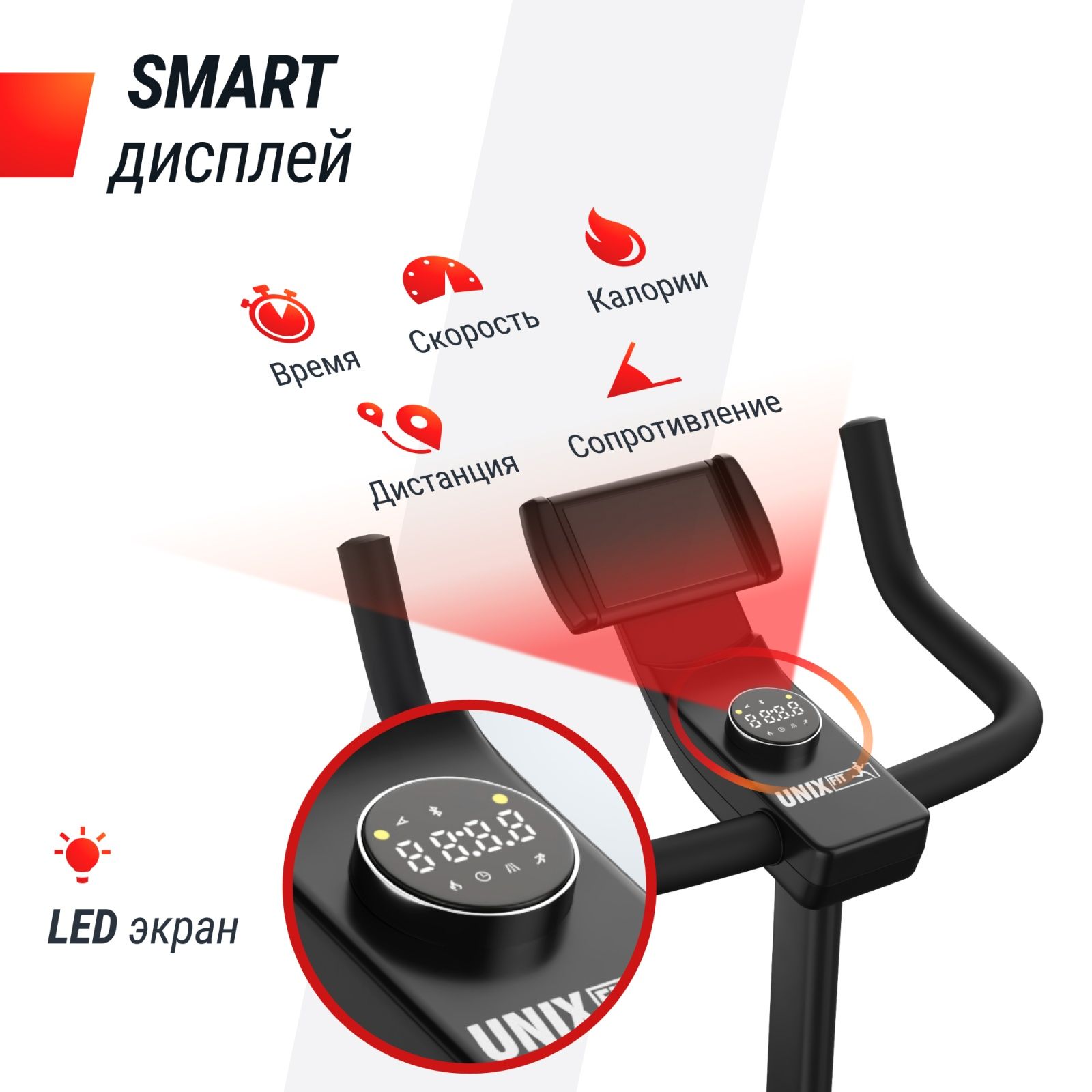 Встроенный SMART LED-дисплей отображает важные показатели тренировки: время, скорость, расстояние, сопротивление и количество сожженных калорий. Это позволяет отслеживать прогресс и мотивировать себя на новые достижения. На корпусе велотренажера расположен разъем USB Type-C который можно использовать для зарядки внешних устройств и как дополнительный источник питания дисплея тренажера, в случае низкой нагрузкой на генератор, например при занятиях для реабилитации.
