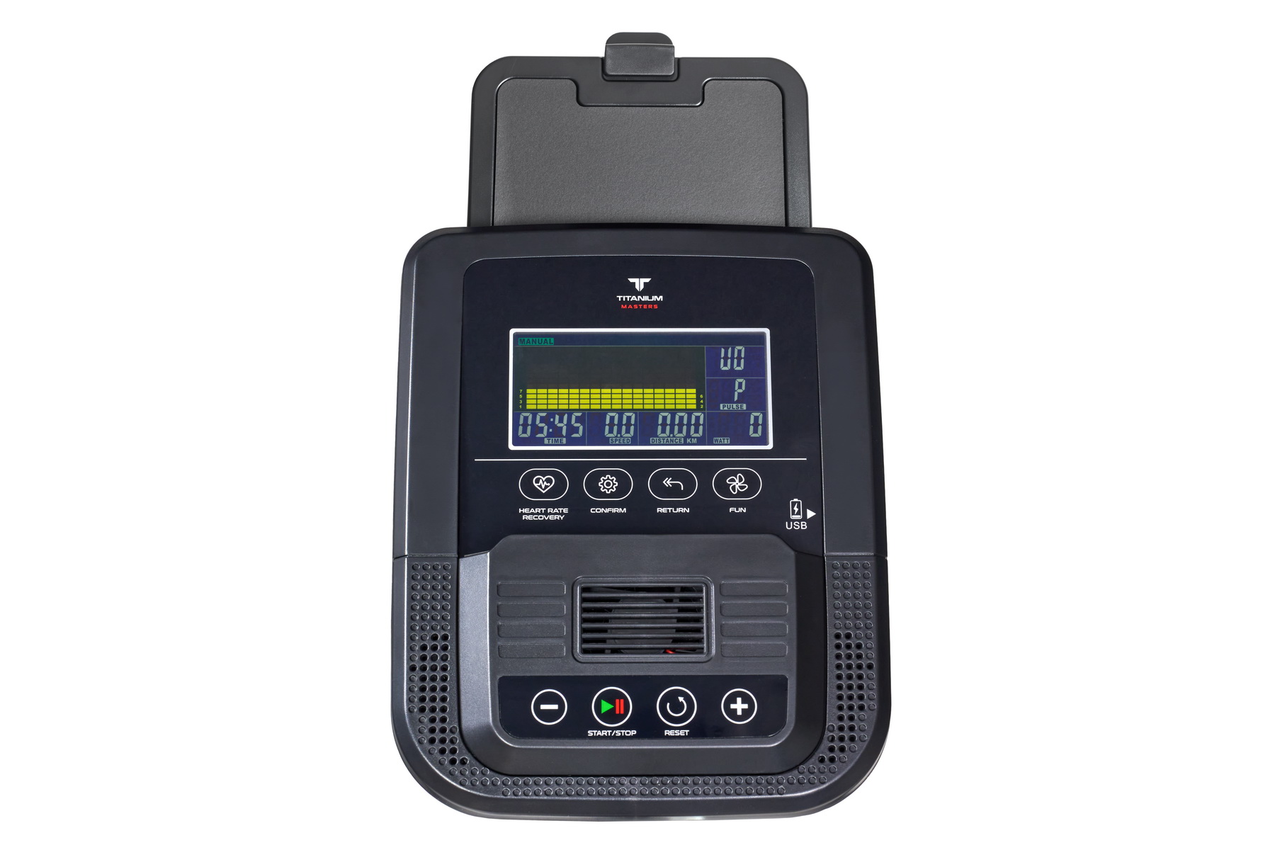 Тренировочный компьютер представлен многофункциональным цветным LCD-дисплеем диагональю 5.5 дюйма (14 см.) с удобными сенсорными клавишами управления. Консоль специально адаптирована под комфортное использование смартфона или планшета – девайсы можно расположить либо на центральной части консоли, либо сверху. С просмотром любимого сериала рутинная тренировка становится значительно бодрее. Не забыл производитель и о функции подзарядки – для этого есть предназначенный для этого USD выход, от которого можно запитать мобильное устройство.