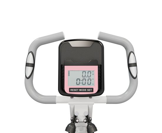 На дисплее велотренажера отображаются дистанция, время, сожженные калории, общий пробег и пульс. Пульс контролируется датчиками, расположенными на поручнях. Консоль велотренажера работает от батареек типа AAA.