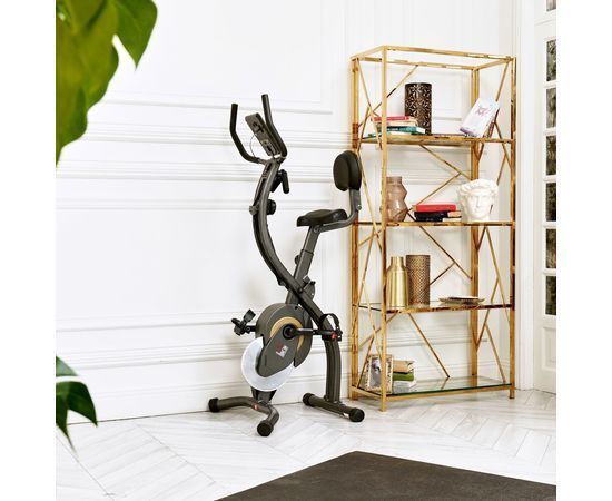 Для удобства пользователя велотренажер оснащен регулируемым по высоте сиденьем (5 уровней), передней опорной стойкой с 2 подвижными колесами для удобства транспортировки, педалями с регулируемыми ремешками и компенсаторами неровности пола. Велосипед удобно складывается и экономит место, а также имеет подставку под планшет.