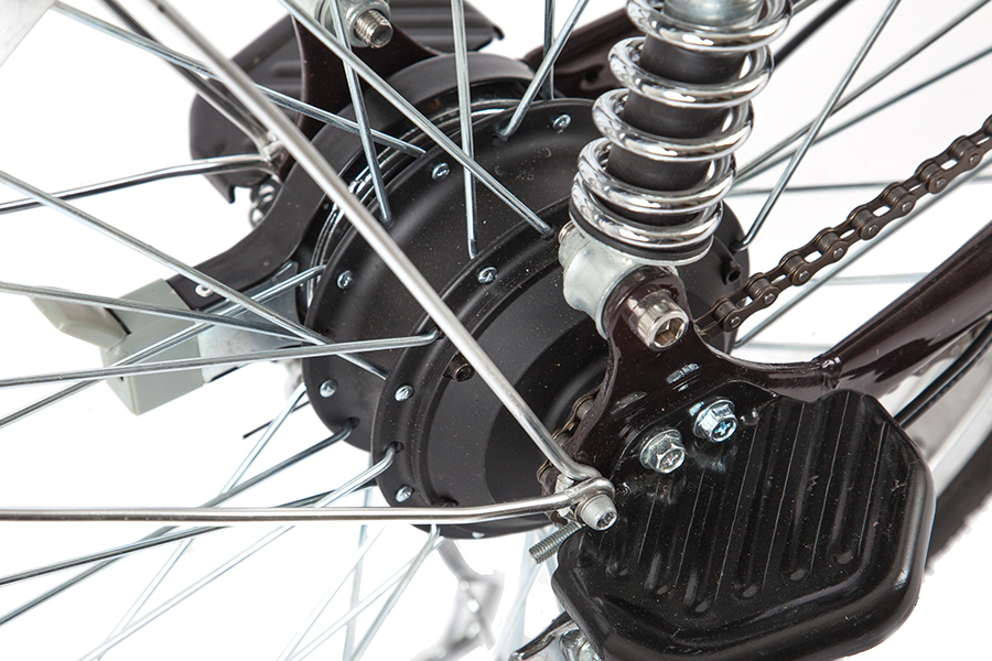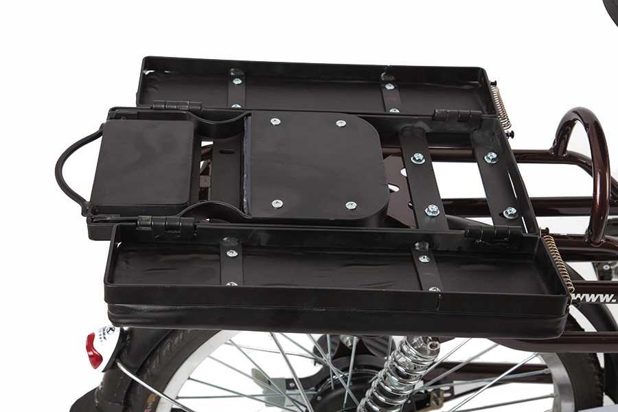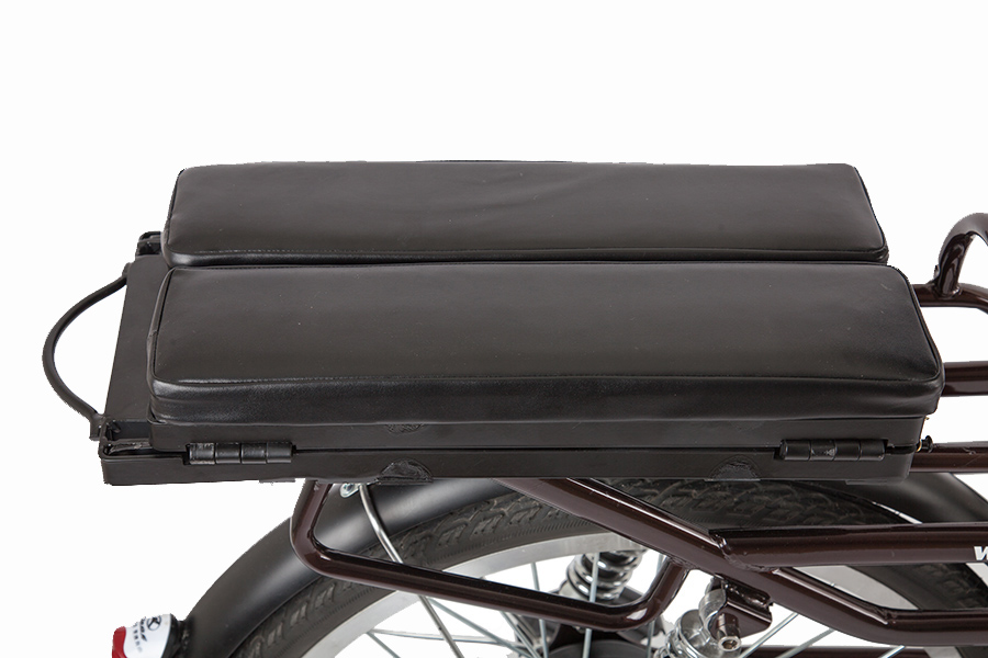 Электровелосипед оборудован полноценным вторым сиденьем с мягким верхом для перевозки пассажира, которое можно разложить в ширину, увеличив площадь багажника для удобства перевозки габаритных грузов. Пара пружинных амортизаторов, расположенных под задним багажником, а также амортизационная вилка спереди позволят сделать поездку максимально комфортной.