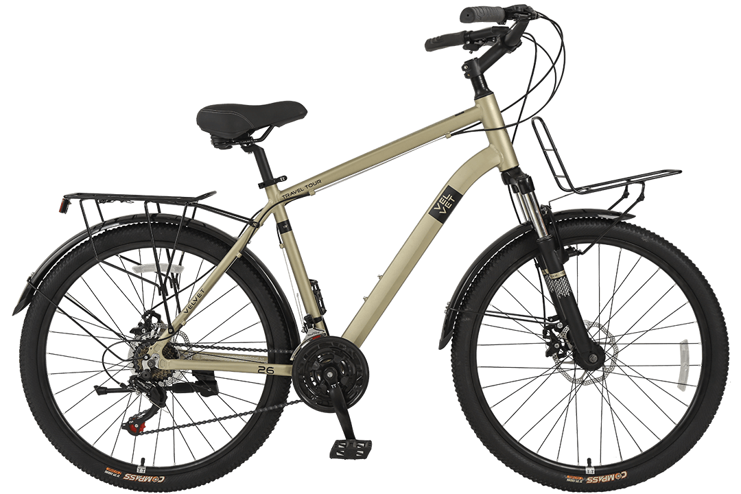 Перед вами новая модель велосипеда TT Velvet 26 2021. Рама изготовлена из алюминия, существует выбор из двух расцветок – бежевая и тёмно-серая. Тип рамы – хардтейл, спереди установлена стальная амортизационная вилка с алюминиевой короной. Колёса собраны на стальных втулках с промышленными подшипниками и двойных алюминиевых ободах, прочность и надёжность их не вызывает сомнений. Обуты колёса в городскую резину Wanda Compass с низким протектором. Велосипед этот предназначен для неспешной езды по городу или парку, поэтому особых внедорожных качеств от него не требуется.