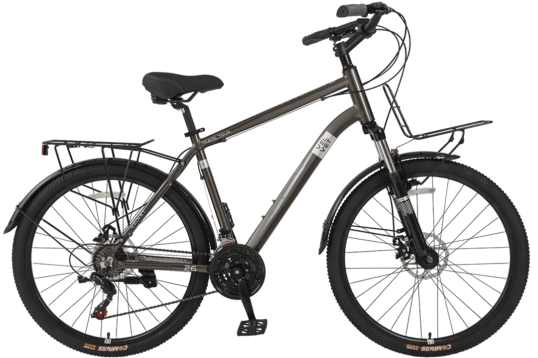 Перед вами новая модель велосипеда TT Velvet 26 2021. Рама изготовлена из алюминия, существует выбор из двух расцветок – бежевая и тёмно-серая. Тип рамы – хардтейл, спереди установлена стальная амортизационная вилка с алюминиевой короной. Колёса собраны на стальных втулках с промышленными подшипниками и двойных алюминиевых ободах, прочность и надёжность их не вызывает сомнений. Обуты колёса в городскую резину Wanda Compass с низким протектором. Велосипед этот предназначен для неспешной езды по городу или парку, поэтому особых внедорожных качеств от него не требуется.